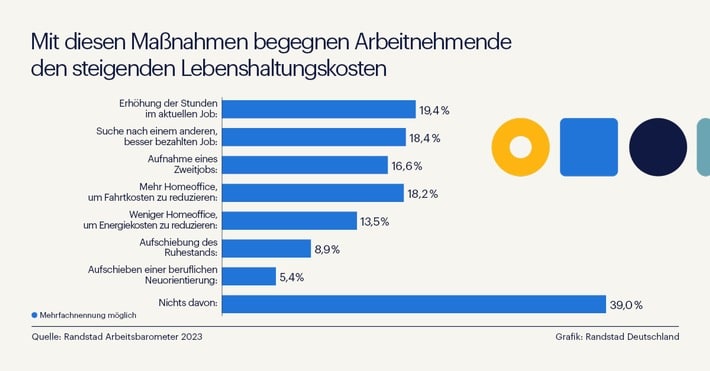 Fast jeder fünfte Arbeitnehmende in Deutschland erwägt derzeit eine Kündigung, um sich eine besser bezahlte Stelle zu suchen. Das zeigt das aktuelle Randstad Arbeitsbarometer 2023. 18,4% der Befragten geben an, sich angesichts von Inflation und steigenden Lebenshaltungskosten mit einem Jobwechsel zu beschäftigen, um die täglichen Kosten weiterhin bestreiten zu können. 19,4% möchten die Stundenanzahl in ihrem aktuellen Job erhöhen; 16,6% haben sich bereits einen Nebenjob gesucht oder beabsichtigen dies in naher Zukunft.