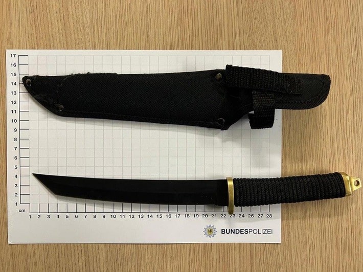 Bei einem 17-jährigen Griechen fanden die Bundespolizisten am Donnerstagabend ein Kampfmesser mit einer Klingenlänge von 22 cm. Das Messer wurde sichergestellt und ein Ermittlungsverfahren eingeleitet. Zudem stellte die Bundespolizei einen Teleskopschlagstock, ein Tierabwehrspray und ein Taschenmesser sicher.