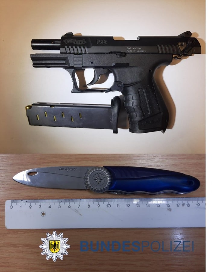 Donnerstagnachmittag gegen 16:30 Uhr trafen Einsatzkräfte der Bundespolizei am Siegener Hauptbahnhof auf einen 23-jährigen Bahnreisenden. Bei der Kontrolle wirkte der Mann mit eritreischer Staatsangehörigkeit sichtlich nervös und händigte auf Nachfrage Betäubungsmittel, hier Cannabis ca. 9 Gramm, an die Beamtin und Beamten aus. Auf der Dienststelle fanden die Einsatzkräfte zusätzlich eine Schreckschusspistole sowie ein Einhandmesser bei dem Mann aus Kreuztal auf und stellten beide gefährlichen Gegenstände sicher. Der Mann wollte sich zum Sachverhalt nicht weiter äußern, ein durchgeführter Atemalkoholtest zeigte einen Wert von 0 Promille an. Wegen des Verdachts des unerlaubten Besitzes von Betäubungsmitteln und des Verstoßes gegen das Waffengesetz fertigten die Einsatzkräfte der Bundespolizei jeweils eine Strafanzeige. Zusätzlich muss sich der Mann wegen der Ordnungswidrigkeit des Mitführens des Einhandmessers (Klingenlänge ca. 8 cm) verantworten.
