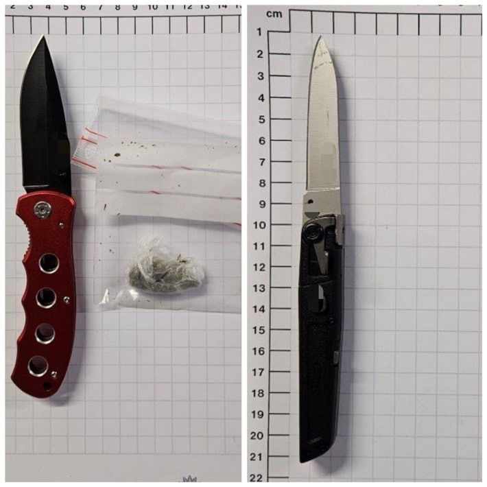 Eine knappe Stunde später, gegen 19 Uhr, passierte ein 32-Jähriger die Einsatzkräfte im Hauptbahnhof. Die Beamten nahmen einen intensiven Marihuana-Geruch wahr, welcher von dem albanischen Staatsangehörigen ausging. Auf Nachfrage händigte er ein Verschlusstütchen mit Cannabiskraut, sowie ein Einhandmesser aus.