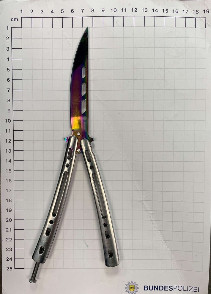 Bei einer Durchsuchung stellten die Beamten dann aber ein Butterflymesser fest. Dabei handelt es sich um ein Faltmesser mit zweigeteilten, auf einer Ebene schwenkbaren Griffen.