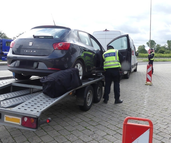 Ein mittels Anhänger transportierter Pkw wurde bei der Einreise aus den Niederlanden kontrolliert und als gestohlen identifiziert. Nach Übergabe des Sachverhaltes an die zuständige Landespolizei wurde das Fahrzeug sichergestellt und eingeschleppt.
