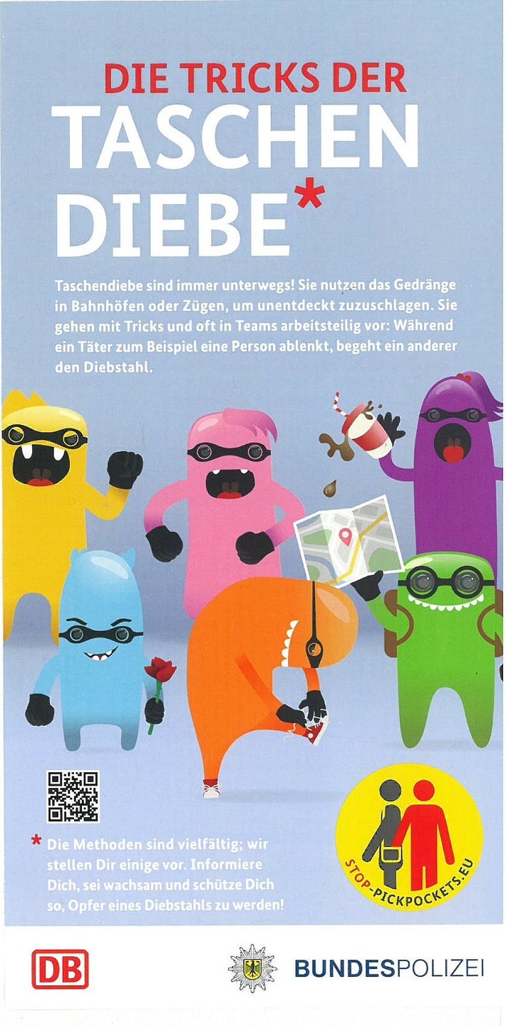 Am Stand der Bundespolizei werden Reisende über die Tricks der „Langfinger“ informiert, was durch Flyer einer europaweiten Kampagne unter dem Link: www.stopp-pickpockets.eu mit eigens erschaffenen bunten Monstern jedem eindrucksvoll vermittelt wird.