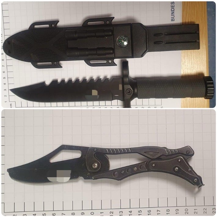 Die Einsatzkräfte brachten den 45-Jährigen zur Wache und durchsuchten ihn, um Ausweisdokumente aufzufinden. Dabei stellten die Polizisten ein Einhandmesser, ein Survival-Messer, ein Kubotan und zwei Scheren sicher.