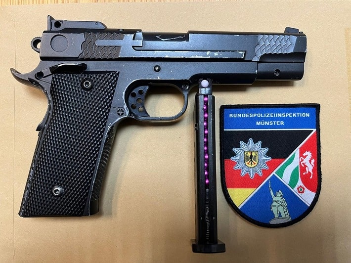 Die Einsatzkräfte stoppten den Mann unter gebotener Vorsicht und stellten die Waffe sicher. Hierbei handelte es sich um eine sogenannte Softair-Waffe. Das Magazin der Waffe war mit Kunststoffgeschossen befüllt und die Waffe wurde durch den Deutschen zugriffsbereit geführt.