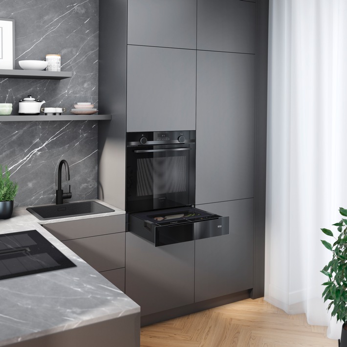 Kleines Format, große Möglichkeiten: Mit der ersten Dampfschublade der Welt präsentiert Siemens Hausgeräte ein zukunftsweisendes Konzept für moderne Einbauküchen. Auf minimalem Raum kombiniert es intelligente Technologie und Design für eine überraschende kulinarische Vielfalt. Die grifflose Schublade aus schwarzem Glas kann entweder mit einem Ofen kombiniert oder einzeln platziert werden. Dadurch erweist sie sich als Problemlöser für alle, die gesund kochen möchten, ohne viel Platz zu haben.