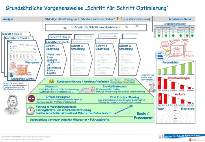 Im finalen Schritt besteht die Aufgabe darin, Standards zu implementieren und diese fortlaufend zu optimieren. Dabei ist es essenziell, nicht nur Produktionsstandards festzulegen, sondern auch Standards für Besprechungen, Termine und die Systematik der Verbesserung einzuführen. Jeder Prozess wird standardmäßig durch die Führungskräfte „betreut“. In jedem Prozess gibt es eine größte Verschwendung. Die Herausforderung für Führungskräfte und Mitarbeiter besteht darin, diese „größte Verschwendung“ zu identifizieren und zu reduzieren. Auf diese Weise garantieren Firmen ein dauerhaftes Fundament, um ihre Produktivität durchgehend zu steigern und einen kontinuierlichen Verbesserungsprozess zu gewährleisten.