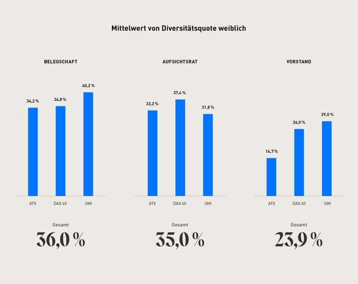 86 Prozent der Unternehmen in DAX 40, SMI und ATX habe spezifische Ziele hinsichtlich des Frauenanteils in ihrer Belegschaft formuliert, was ein deutliches Engagement für Geschlechterdiversität zeigt. So hat auch der Anteil von „Frauen in Führungspositionen“ (Vorstand und Aufsichtsrat) in allen drei Top-Indizes weiter zugenommen. Im DAX 40 stieg der Gesamtanteil von Frauen im Vorstand auf 26 Prozent, nach 23 Prozent im Vorjahr. In den DAX 40-Aufsichtsräten sind mittlerweile 37,4 der Mitglieder weiblich.