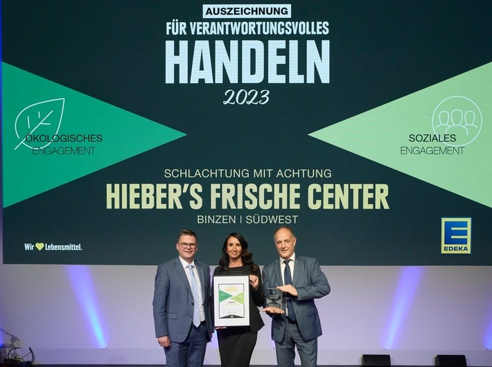 Die „Auszeichnung für verantwortungsvolles Handeln“ des EDEKA-Verbunds geht dieses Jahr an Hieber’s Frische Center. Das Unternehmen aus Binzen erhält die Ehrung für sein 2019 ins Leben gerufenes Tierwohl-Projekt „Schlachtung mit Achtung“. In Zusammenarbeit mit lokalen Landwirtschaftsbetrieben und regionalen Metzgereien stellt das zukunftsweisende Konzept artgerechte Haltungsformen und die verantwortungsbewusste Verarbeitung von Rindern in den Mittelpunkt. Anstatt die Tiere zum Schlachthof zu transportieren und sie so unnötigen Stresssituationen auszusetzen, wird der Schlachthof in die beteiligten landwirtschaftlichen Betriebe gebracht. Die Rinder werden vor Ort in einem ihnen vertrauten Umfeld geschlachtet.