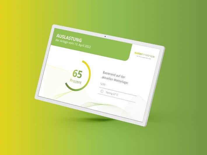 Das Infoscreen-System solarmetrics visualisiert die eingespeiste Energiemenge eigener Photovoltaikanlagen anhand aussagekräftiger Infografiken und setzt die erzeugten Kilowattstunden mit leicht verständlichen Vergleichswerten in Beziehung. Der Betrachter erhält somit nicht nur Auskunft über die tatsächliche Stromproduktion der Anlage, sondern auch über den Umfang der Nutzung und der damit einhergehenden CO2 Kompensation. Das stärkt die Sensibilisierung zum Thema Nachhaltigkeit und stärkt das Image des Unternehmens!