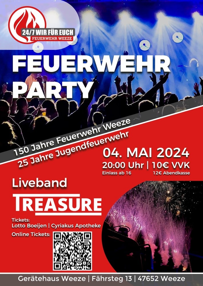 „Seit 150 Jahren engagieren sich Feuerwehrleute zum Wohle der Weezer Bevölkerung. Die Feuerwehr hat somit eine lange Tradition und wenn auch die Aufgaben über ein Landesgesetz klar geregelt sind, vereint doch alle Generationen bis heute, dass der Einsatz weit über den gesetzlichen Rahmen hinausgeht.“ bekräftigt der Leiter der Feuerwehr Weeze, Gemeindebrandinspektor Michael Winthuis im Grußwort zur Festzeitschrift. Am Samstag, 4. Mai 2024 soll dies auch in der Öffentlichkeit gezeigt werden. Ab 13 Uhr findet am Feuerwehrhaus in Weeze am Fährsteg ein Tag der offenen Tore mit einem bunten Programm statt. Zu sehen sind außerdem diverse Vorführungen sowie für Kinder die Möglichkeit der Teilnahme an einer Feuerwehrolympiade. Gegen 16.30 Uhr folgt der Festumzug vom Bürgerhaus zum Feuerwehrhaus mit anschließendem Festakt, bevor ab 20 Uhr die Band Treasure für die nötige Stimmung zur öffentlichen Feuerwehrparty sorgt! Tickets für die Abendveranstaltung gibt es im Vorverkauf vergünstigt in der Cyriakusapotheke oder bei Lotto Boeijen in Weeze, aber auch im Online Shop. Einen Link hierzu findet man unter feuerwehr-weeze.de Wir laden Sie herzlich ein mit uns zu feiern!