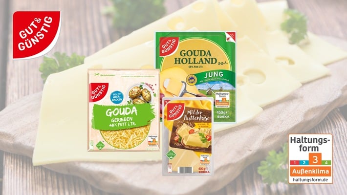 Der Großteil der Artikel unter GUT&GÜNSTIG soll bereits bis März 2024 auf Milch aus höherer Haltungsform umgestellt werden. Weitere Käseprodukte werden in Kürze folgen. Um den Bedarf an Milch aus Haltungsform 3 zu decken, arbeitet EDEKA mit namhaften Lieferanten zusammen. Die Listung der Produkte kann aufgrund der Verfügbarkeit der Rohware regional unterschiedlich ausfallen.