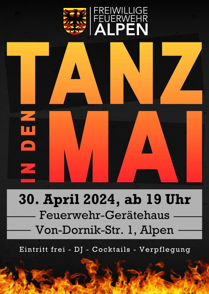 Nach der coronabedingten Pause geht der Tanz in den Mai bei der Freiwilligen Feuerwehr Alpen in eine neue Runde. Erstmals findet die Veranstaltung im neuen Feuerwehr-Gerätehaus der Einheit Alpen statt.