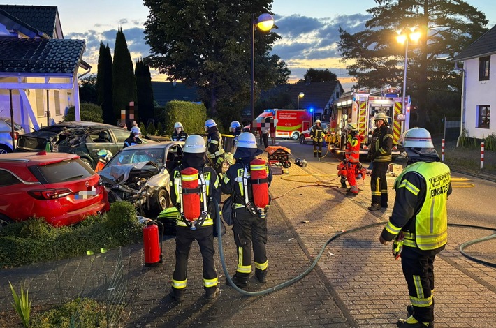 FW Bad Honnef: Schwerer Verkehrsunfall mit zwei Verletzten – PKW kollidiert mit geparkten Fahrzeugen und Carport