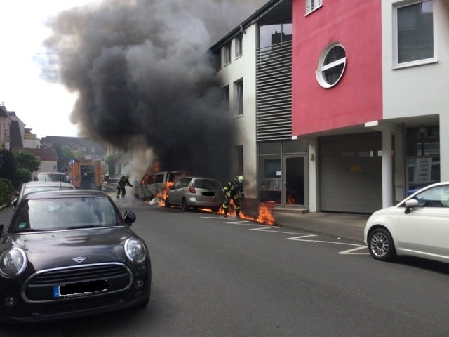 Beim Eintreffen der ersten Einsatzkräfte hatte sich der Brand des PKW´s bereits auf zwei weitere Fahrzeuge ausgebreitet. Der vollentwickelte PKW-Brand drohte auf benachbarte Gebäude überzugreifen. Einzelne Gebäudeteile standen bereits in Flammen. Auslaufende Betriebsstoffe waren ebenfalls in Brand geraten. Umgehend wurde mit mehreren Löschrohren eine Brandbekämpfung eingeleitet. Parallel wurden die Wohnungen durch einen Atemschutztrupp kontrolliert. Durch den schnellen Löscherfolg konnte eine Brandausbreitung auf die direkten Nachbargebäude verhindert werden. Sie wurden durch das Feuer allerdings stark beschädigt. Für die Bewohner bestand keine Gefahr. Sie konnten frühzeitig die Wohnungen verlassen. Der PKW brannte komplett aus. Eine Wohnung ist so stark betroffen das sie aktuell nicht bewohnbar ist. Weitere Nutzungseinheiten konnten nach Abschluss der Einsatzmaßnahmen und Entrauchung mit Elektro- und Motorlüfter an die Bewohner übergeben werden. Eine stark beschädigte Straßenlaterne muss durch die Stadtwerke Bonn entfernt werden. Durch die enorme Hitzeentwicklung wurden mehrere Fahrzeuge und Fensterscheiben auf der gegenüberliegenden Straßenseite beschädigt. Verletzt wurde niemand. Zur Brandursachenermittlung wurde die Einsatzstelle an die Polizei übergeben. Während des Feuerwehreinsatzes war der Bonner Talweg zwischen der Graf-Stauffenberg-Str. und Lotharstraße für den Verkehr gesperrt.
