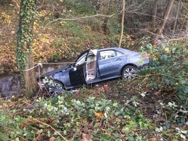 Bonn-Alt Godesberg, Marienforster Straße; 08.12.2022, 15:23 Uhr, Aus bislang ungeklärten Gründen verlor am frühen Nachmittag eine PKW-Fahrerin die Kontrolle über ihr Fahrzeug und rutschte eine Böschung herab. Die Kollision mit einem massiven Baum verhinderte das der PKW im Godesberger Bach zum Stehen kam.