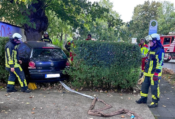 Beim Eintreffen der ersten Einsatzkräfte der Innenstadtwache bestätigte sich diese Lage. Ein PKW war im Bereich der Bushaltestelle Mettestraße von der Fahrbahn abgekommen, durch eine Hecke gefahren und zwischen der Mauer einer Garage und einem Baum zum stehen gekommen. Der verletzte Fahrer des Wagens konnte sich nicht selbstständig aus dem PKW befreien. Einsatzkräfte des Rettungsdienstes und ein Notarzt begannen noch im Wagen mit einer Erstversorgung des Fahrer. Anschließend wurde der Wagen mit Hilfe einer sogenannten Rundschlinge zurückgezogen und der Fahrer schonend aus dem Wagen befreit. Er wurde mit einem Rettungswagen zur weiteren Behandlung in ein Krankenhaus transportiert.