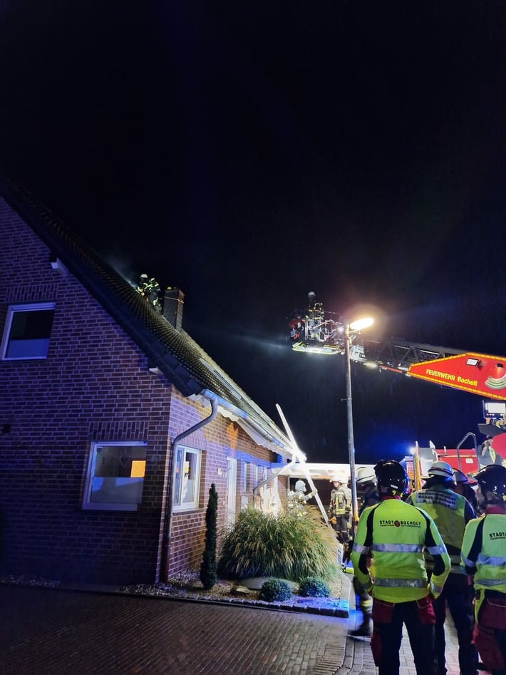 Auf der Barloer Ringstraße kam es durch einen Blitzeinschlag zu einem Entstehungsbrand in einem Dachstuhl. Durch die Feuerwehr wurde mit mehreren Trupps und unter Einsatz der Drehleiter der betroffene Teil des Daches abgedeckt und die brennende Isolierung entfernt und abgelöscht. Hierbei wurde die Feuerwehr Bocholt durch die Feuerwehr Rhede mit einem Löschfahrzeug unterstützt. Insgesamt waren an dieser Einsatzstelle 30 Einsatzkräfte mit 5 Fahrzeugen für ca. zwei Stunden im Einsatz.