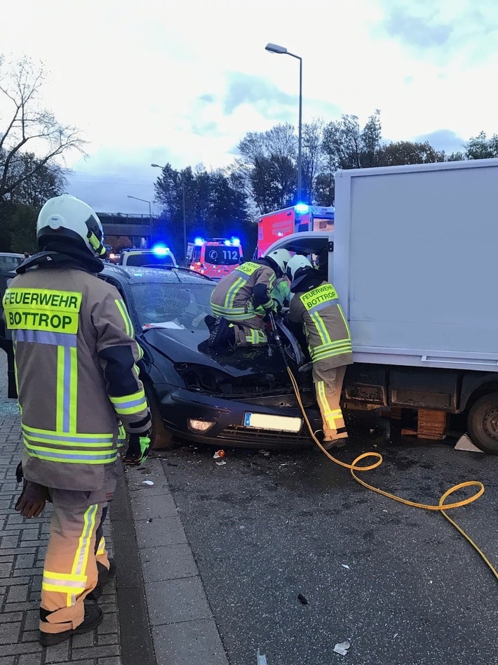 Am heutigen Dienstag, 31.10.2023, wurde die Feuerwehr Bottrop um 16:45 Uhr zu einem Verkehrsunfall auf der Straße Im Gewerbepark gerufen. Ca. 250 Meter hinter der Kreuzung zur Scharnhölzstraße war ein Kleintransporter mit einem entgegenkommenden Pkw kollidiert. Während der Pkw-Fahrer sein Fahrzeug mit leichten Verletzungen selbstständig verlassen konnte, wurde der Fahrer des Kleintransporters durch die Wucht des Aufpralls in seinem Fahrzeug eingeklemmt und schwer verletzt. Beim Eintreffen des Hilfeleistungszugs der Feuerwehr Bottrop wurden die Verletzten durch mehrere Ersthelfer betreut.
