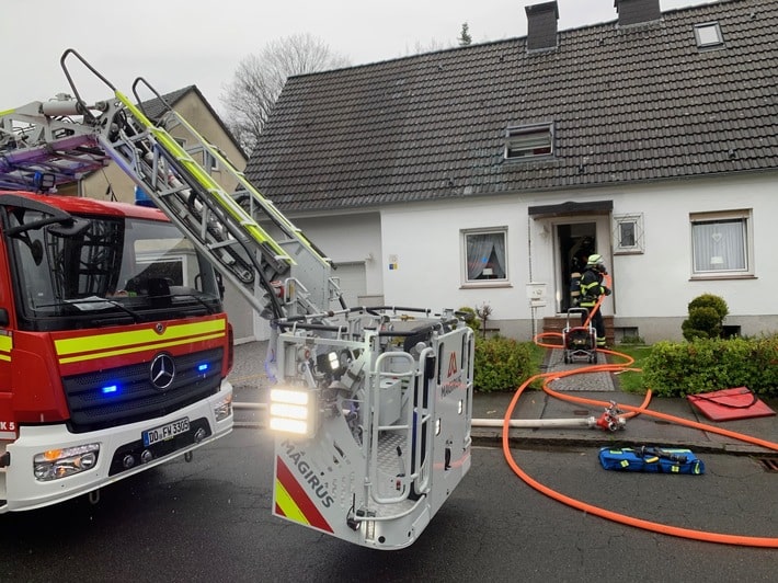 Als die Einsatzkräfte der Feuerwache 5 (Marten) und 8 (Eichlinghofen) an der Doppelhaushälfte eintrafen, war eine leichte Rauchentwicklung aus dem Hauseingang erkennbar. Der 90-jährige Bewohner kam der Feuerwehr entgegen und berichtete von einem Feuer.