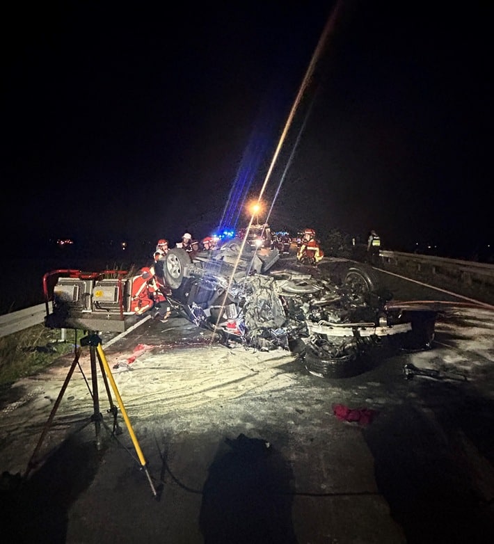 Im Kurvenbereich war es zu einem Frontalzusammenstoß zwischen zwei Pkw gekommen. Eines der Unfallfahrzeuge stand auf der Leitplanke. Das andere Fahrzeug lag nach mehrfachem Überschlag auf dem Dach.