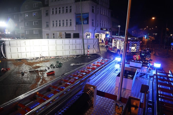 FW-E: 40-Tonner touchiert mehrere Fahrzeuge, einen Bus und stürzt dann um – fünf Personen zum Teil schwer verletzt