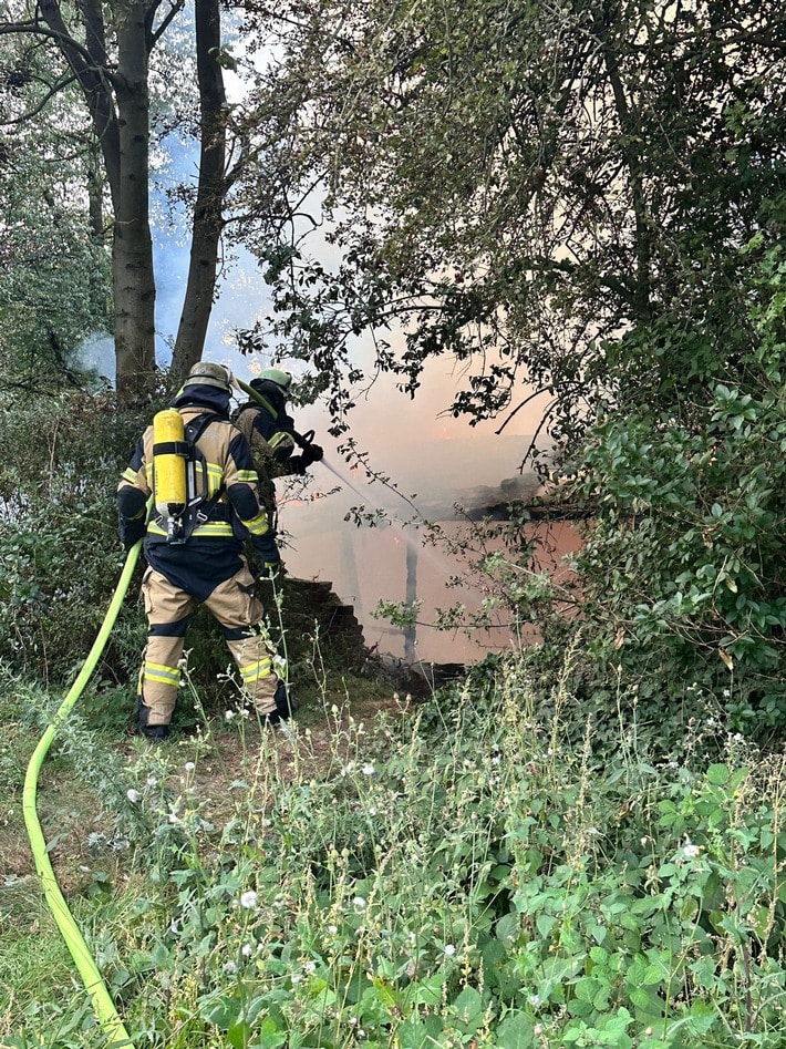 An diesem bereits sehr einsatzreichen Mittwoch, den 11.10.2023, wurde die Essener Feuerwehr am frühen Abend zu einer unklaren Feuermeldung nach Essen-Altendorf alarmiert. Im Bereich zwischen dem Radschnellweg Ruhr und der Straße Kleine Buschstraße hatten Anwohner eine Rauchentwicklung mit Feuerschein im dichten Gestrüpp gesichtet und sofort die Feuerwehr informiert. Die erst eintreffenden Einsatzkräfte der nahegelegenen Feuerwache 2 erkundeten den Bereich und fanden eine ca. zehn Quadratmeter große, dicht zugewachsene Hütte in Vollbrand vor. Etwas schwieriger gestaltete sich die Zuwegung zu dem brennenden Objekt, sodass die Einsatzkräfte sich über den Radschnellweg Ruhr einen Zugang zur Hütte suchen mussten. Sofort wurden mehrere handgeführte Strahlrohre eingesetzt, um das Feuer schnell unter Kontrolle zu bringen und ein Übergreifen auf die Vegetation zu verhindern. Durch den massiven Löschangriff konnte nach rund einer Stunde die Einsatzmaßnahmen beendet werden.