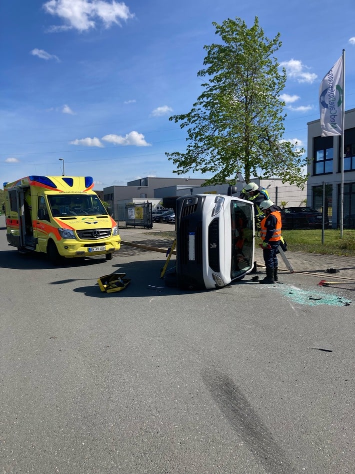 Im Kreuzungsbereich Henrichs-Allee / Zum Kraftwerk kam es zu einem Unfall zwischen einem PKW und einem Transporter. Hierbei kam der Transporter auf der Beifahrerseite zum Liegen. Die beiden Fahrer der Unfallfahrzeuge wurden hierbei zum Glück nicht eingeklemmt. Durch den direkt an der Unfallstelle ansässigen privaten Rettungsdienst wurden beide Fahrzeugführer umgehend erstversorgt.