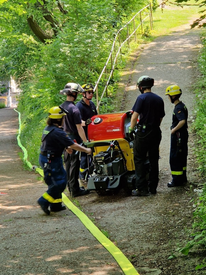 Am Samstag, den 11.05.2024, rückten die Einheiten Volmarstein, Grundschöttel, Esborn und Alt-Wetter mit dem Stichwort „Waldbrand“ zu einer Übung auf dem Burgberg nach Volmarstein aus. Vor Ort wurde durch die ersten Einsatzkräfte festgestellt, dass es sich bei dieser Übung simuliert durch mehrere Feuerschalen, um einen ausgedehnten Vegetationsbrand im Bereich der Burgruine handelte. Somit wurde direkt ein Löschfahrzeug über den schmalen Kramerweg bis zur Burgruine entsandt sowie eine Wasserversorgung von einem Hydranten an der Hauptstraße Ecke Am Vorberg über rund 400 Meter entlang des Kramerweges bis zur Burgruine verlegt. Parallel wurde auf dem Parkplatz des Burghotels ein 5000 Liter fassender Wasserbehälter aufgebaut, welcher mit Löschfahrzeugen im Pendelverkehr von einem Hydranten an der Hagener Straße immer wieder gefüllt wurde. Von hier aus wurde über eine rund 250 Meter lange Schlauchstrecke ebenfalls Wasser über den Fußweg hinter dem Burghotel bis zur Burgruine gefördert. Da das Gelände auf den beiden Zugängen zur Burg sehr steil ist, mussten unter anderem Verstärkerpumpen ins Gelände gebracht werden. Hierbei unterstützte die Fachgruppe Notinstandsetzung des THW Ortsverband Wetter (Ruhr) mit einem Raupendumper, womit dann auch weiteres Material den Weg hinaufgefahren wurde. An der „Brandstelle“ kamen dann 4 C- und 5 D-Strahlrohre zum Einsatz, um das Feuer abzulöschen.