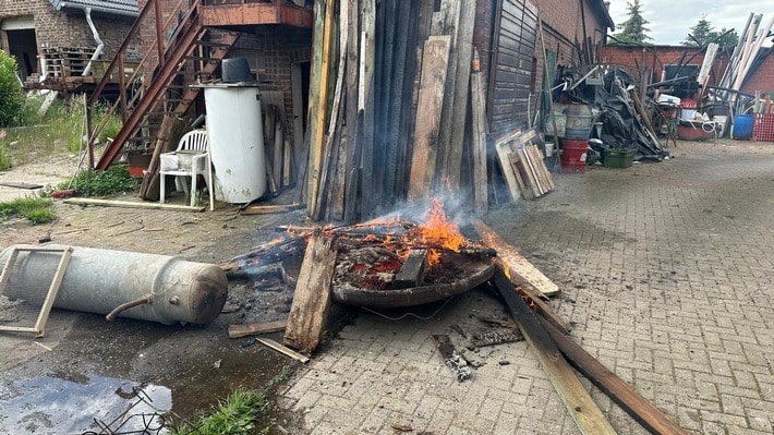 Mit viel Glück konnte heute Nachmittag (26.05.2024) auf der Moyländer Straße ein Gebäudebrand verhindert werden. Auslöser war eine unbeaufsichtigte Feuerschale. Hier sollten Holzabfälle verbrannt werden. Durch fehlenden Sicherheitsabstand hatte sich das Feuer auf eine Balkenlage ausgedehnt, die an ein Gebäude gelehnt war. Ein Passant hatte die starke Rauchentwicklung wahrgenommen und beherzt eingegriffen: Er verständigte die Grundstückeigentümerin, die den Notruf 112 wählte. Dann unternahm er eigene Löschversuche und entfernte brennende Balken vom Gebäude.