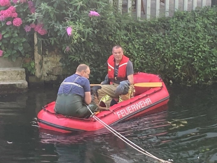 Als die ersten Einsatzkräfte über den Landweg eintrafen, wurde kurzerhand ein Schlauchboot besetzt. Der erschöpfte Hund ließ sich ins Boot heben und konnte am anderen Ufer unversehrt dem besorgten Besitzer übergeben werden.