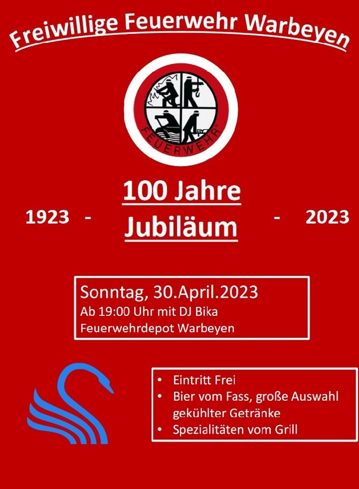 Die Löschgruppe Warbeyen wird in diesem Jahr einhundert Jahre. Am Sonntag dem 30. April 2023 findet ab 19:00 Uhr am Feuerwehrhaus in Warbeyen (Huisberdener Straße 8) die Jubiläumsfeier statt.