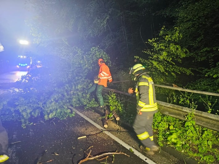 Die wetterbedingte Einsatzserie für die Freiwillige Feuerwehr Königswinter begann um 16.26 Uhr am Montagnachmittag. Am Lützer Weg in Oberpleis sorgte Regenwasser, das aus einem Feld trat, für die Überschwemmung des Kellers eines dahinter liegenden Wohngebäudes. Einsatzkräfte sicherten den Bereich mit Sandsäcken. Wenig später war die Landesstraße 268 zwischen Heisterbacherrott und Kloster Heisterbach von Schlamm und Wasser betroffen, das aus dem Wald auf die Fahrbahn floss. Hier wurden durch die Feuerwehr die Kanaleinflüsse von Schwemmgut befreit. Ab 21.14 Uhr waren die Einsatzkräfte in diesem Abschnitt erneut gefordert. Da die Fahrbahn stark verunreinigt war und die Abflusssituation nicht abschließend verbessert werden konnte, erfolgte hier eine Sperrung der Straße durch die Polizei. Die Feuerwehr beendete hier den Einsatz um 23.40 Uhr. Auf der Landesstraße 331 zwischen Margarethenhöhe und Königswinter stürzte nach 5 Uhr am Dienstagmorgen ein Baum auf die Fahrbahn, bei zwei weiteren Bäumen bestand eine Umsturzgefahr. Auch hier erfolgten Fäll- und Aufräumungsarbeiten durch alarmierte Wehrleute. Während des Einsatzes blieb die Straße rund 20 Minuten gesperrt. Im Laufe des Dienstagmorgens war hier auch ein weiterer Baum zu entfernen. Weitere Einsatzstellen wurden u.a. auf der Eisbacher Straße in Eisbach und an der Marienstraße in Oberdollendorf registriert.