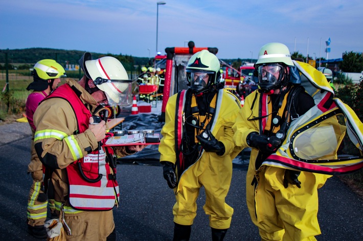 Das Ganze war glücklicherweise nur eine aufwändig geplante und mit vielen Details eingespielte Übungslage für den ABC-Zug, bei dem alle der gut 40 eingesetzten Kräfte mit acht Fahrzeuge in der fast zwei Stunden andauernden Übung ordentlich zu tun hatten. Gefahrguteinsätze für den ABC-Zug sind im Regelfall mit sehr viel Aufwand und einer langen Einsatzdauer verbunden. Die Einsatzkräfte müssen vielfach Einsatzmittel verschiedenster Ausprägung koordiniert und zielgerichtet in den Einsatz bringen. Dabei spielen Achtsamkeit, Sorgfalt und Sicherheit eine besondere Rolle, denn bei vielen Gefahrenstoffen ist mit gesundheitlichen Beeinträchtigungen sowohl für die verunfallten Personen als auch für die eingesetzten Kräfte zu rechnen.