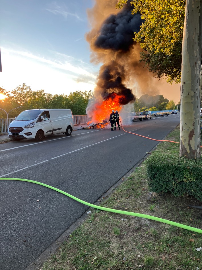 Vor Ort konnte ein brennender Wohnwagen am Straßenrand festgestellt werden. Sofort wurde eine Brandbekämpfung mit einem Trupp unter schwerem Atemschutz und mit einem Strahlrohr ausgerüstet eingeleitet. Parallel sicherte die Polizei die Einsatzstelle gegen den fließenden Verkehr. Nachdem letzte Glutnester abgelöscht wurden, erfolgte eine abschließende Kontrolle der Überreste des Wohnwagens mit einer Wärmebildkamera. Bei dem Brand wurden keine Personen verletzt. Die Brandursache wird durch die Kriminalpolizei ermittelt. (TBi)