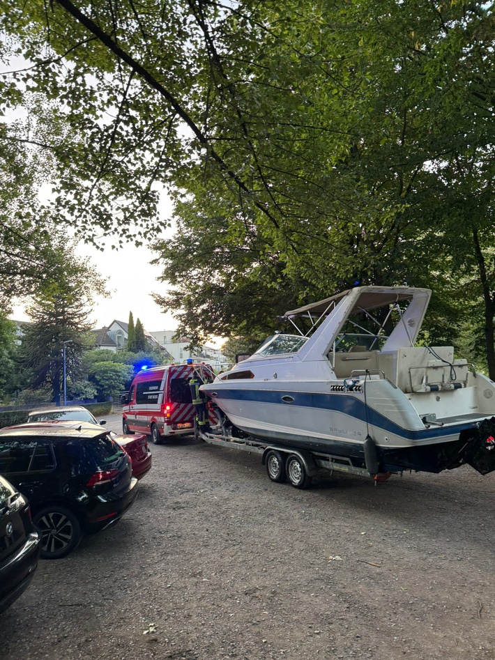 Mithilfe eines herangeschafften Bootstrailers und Schleppwagens eines benachbarten Vereins wurde das Boot durch die Feuerwehr aus dem Wasser gehoben, sodass die Gefahr des Sinkens gebannt war.