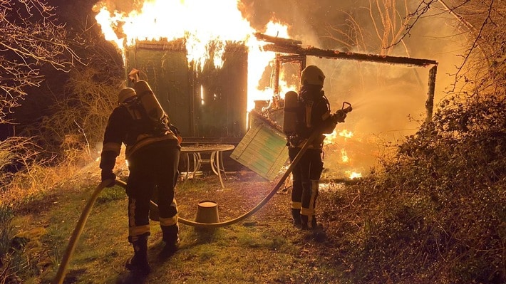Die Leitstelle alarmiert daraufhin drei Löschgruppen der Feuerwehr Stadt Nideggen mit dem Stichwort -unklarer Feuerschein-. Bereits von Nideggen und Berg aus waren Rauch und Feuer sichtbar. Nach dem Eintreffen der ersten Einsatzkräfte stand schnell fest, dass in einem Hang am Waldrand eine unbewohnte Hütte, oder ein ehemaliges Ferienhaus, wie sie oft in Abenden anzutreffen sind, in voller Ausdehnung in Flammen stand. Nachdem die Schlauchleitungen über den Steilhang, bei dem die Frauen und Männer der Wehr einen Höhenunterschied von gut 25 Metern durch unwegsames Gelände überwinden mussten, verlegt waren, konnte die Brandbekämpfung mit zwei Löschrohren aufgenommen werden. Es war allerdings nicht mehr zu verhindern, dass die ca. 10X5m große Hütte komplett abbrannte. Das Übergreifen des Brandes auf den Wald konnte allerdings verhindert werden. Während der Nachlöscharbeiten konnten mehrere Druckgasbehälter gesichert werden. Der Einsatz war gegen 05:00 beendet.