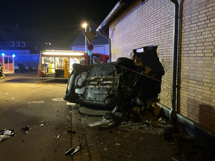 Gegen 02:00 meldeten mehrere Anrufer einen Verkehrsunfall in Nideggen-Schmidt auf der Heimbacher Straße. In deren Verlauf war ein PKW von der Fahrbahn abgekommen und gegen eine Hauswand geprallt. Es sollten sich noch mehrere Personen im Fahrzeug sowie im Gebäude befinden, das Fahrzeug sollte brennen. Umgehend entsendete die Leitstelle nach Alarm- und Ausrückeordnung mehrere Einheiten von Feuerwehr und Rettungsdienst zur gemeldeten Adresse. Als die ersten Einheiten nach kurzer Zeit an der Einsatzstelle eintrafen, stellte sich die Situation dem Einsatzleiter so dar, dass ein Fahrzeug von der Fahrbahn abgekommen war, gegen eine Hauswand geprallt war und zwei Personen im Fahrzeug eingeschlossen waren. Eine weitere Person war unter dem auf der Seite liegenden Fahrzeug eingeklemmt. Zwei Personen, die sich im Gebäude aufgehalten hatten, waren augenscheinlich leicht verletzt, die drei Fahrzeuginsassen sehr schwer verletzt. Die Hauswand war stark beschädigt. Zu einem Brand war es glücklicherweise nicht gekommen.