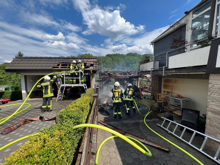 Am gestrigen Freitag den 16.06.2023 gegen 15:00 Uhr, wurden die Einheiten der Feuerwehr Kirchhundem und Hofolpe zu einem gemeldeten Carportbrand in den Flaper Schulweg in Kirchhundem alarmiert. Bereits auf der Anfahrt war eine massive Rauchsäule erkennbar. An der Einsatzadresse brannte das Carport sowie der darin stehende PKW in voller Ausdehnung. Die Flammen griffen bereits auf den Dachstuhl einer angrenzenden Garage und auf eins der zwei darin befindlichen Autos über, zudem drohte das Feuer in das angrenzende Wohnaus überzulaufen. Zwei Atemschutztrupps leiteten umgehend mit zwei C-Rohren die Brandbekämpfung sowie eine Riegelstellung zum Wohnhaus ein, so dass, das Haus geschützt werden konnte und der zweit PKW in der Nachbargarage keinen Schaden nahm. Verletzte gab es nicht zu beklagen. Neben den ca. 35 Einsatzkräfte der Feuerwehr waren der Rettungsdienst des Kreises Olpe und die Polizei im Einsatz.