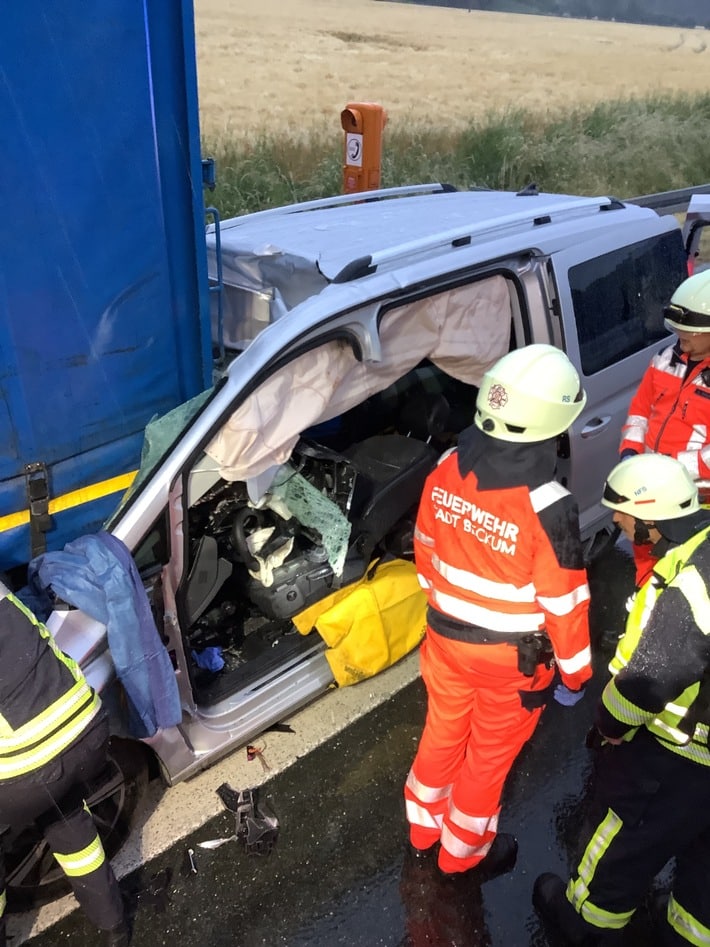 FW Oelde: Verkehrsunfall mit einer eingeklemmten Person auf der A2. PKW fährt unter das Heck eines LKW.
