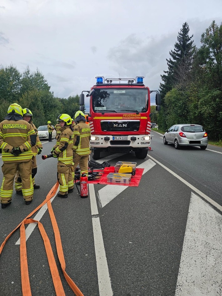 Die Feuerwehr Paderborn rückte zusätzlich zum bereits alarmierten HLF mit einem Wechselladerfahrzeug und dem Abrollbehälter Rüst, zwei Rettungswagen, der ehrenamtlichen Einheit Elsen und zwei Führungsdiensten (B- und C-Dienst) zur Einsatzstelle aus.