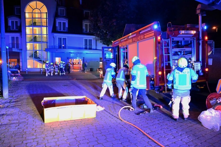 Am Mittwochabend, kurz nach 20:00 Uhr, wurde die hauptamtliche Wache aufgrund eines übel riechenden, unklaren Geruches zu einem Einsatz in ein Pulheimer Hotel gerufen. Vor Ort konnten die Kräfte feststellen, dass dieser Geruch wohl in der ersten Etage seinen Ursprung hatte. Aufgrund der zunächst unklaren Lage und einer Vielzahl von betroffenen Personen wurden durch den Einsatzleiter, Brandoberinspektor Ralf Johnen, weitere Kräfte der freiwilligen Löschzüge aus Pulheim, Stommeln und Brauweiler nachalarmiert. Nach einer ersten Erkundung durch einen mit Atemschutz ausgerüsteten Trupp wurde festgestellt, dass es sich bei der stechend riechenden Substanz um Ammoniak handelte. Parallel wurden 16 Bewohner der betroffenen Etage in das Erdgeschoss und ins Freie verbracht, um für diese mögliche gesundheitliche Gefährdungen zu vermeiden. Durch Messungen der Ammoniakkonzentrationen konnte die Ursache dann gezielt und schnell lokalisiert werden. Ein in einem Hotelzimmer verbauter Kleinkühlschrank war defekt und aus diesem trat das Ammoniak aus. Das Einbaugerät wurde unmittelbar durch die Feuerwehr aus dem Raum entfernt und ins Freie verbracht.