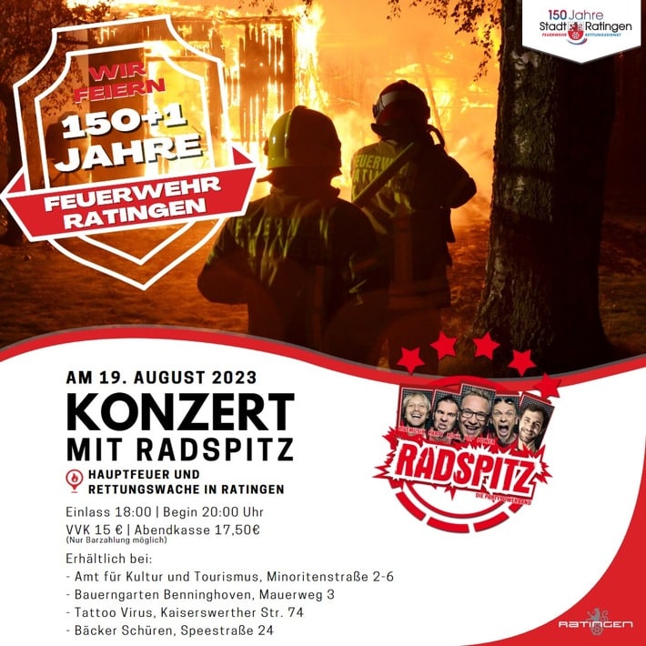 Die Feuerwehr Ratingen lädt am morgigen Abend zur 151 Jahr Feier in die Feuer- und Rettungswache am Voisweg ein. Einlass ist ab 18:00 Uhr. Gefeiert wird mit der bekannten Coverband „Radspitz“ mit der die Feuerwehr Ratingen eng verbunden ist. Wir freuen uns mit ihnen in den Morgen zu feiern! Karten gibt es noch an der Abendkasse!