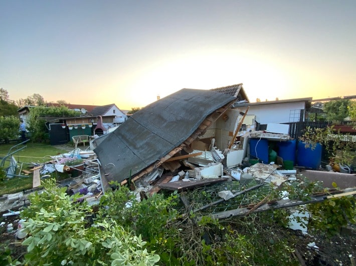 FW Ratingen: Gartenhaus in Kleingartenanlage explodiert, 1 Person verletzt Ratingen Mitte, Formerstraße, 04.06.2023, 04:51 Uhr