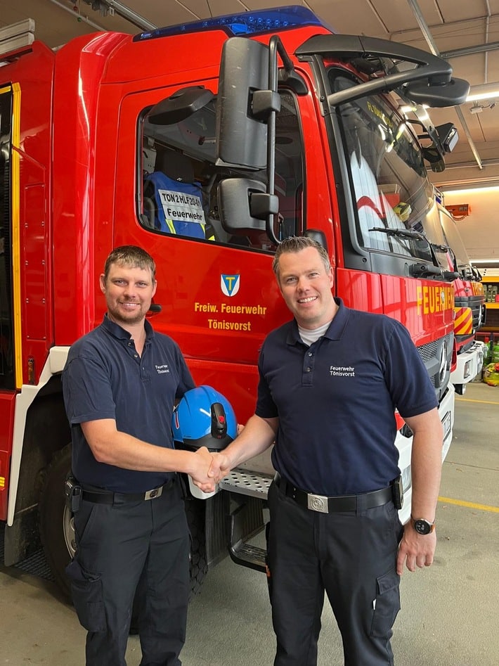 Der Leiter der Freiwilligen Feuerwehr Tönisvorst Jens Griese und den Vorster Löschzugführer Kai Hebben gratulierten herzlich und wünschten Patrick Loyen immer eine glückliche Hand bei der Führung der ihm anvertrauten Einsatzkräfte.