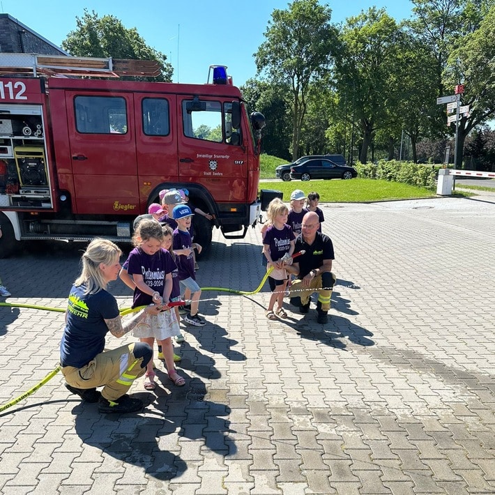 Dienstag, 14.05.2024 – 17 Kinder der Kindertagesstätte Seestern aus Wardt machten sich am Dienstagmittag auf den Weg zur Feuerwehr. Am Standort der Einheit Wardt am Meerend erwartete die Kinder ein spannendes Programm.