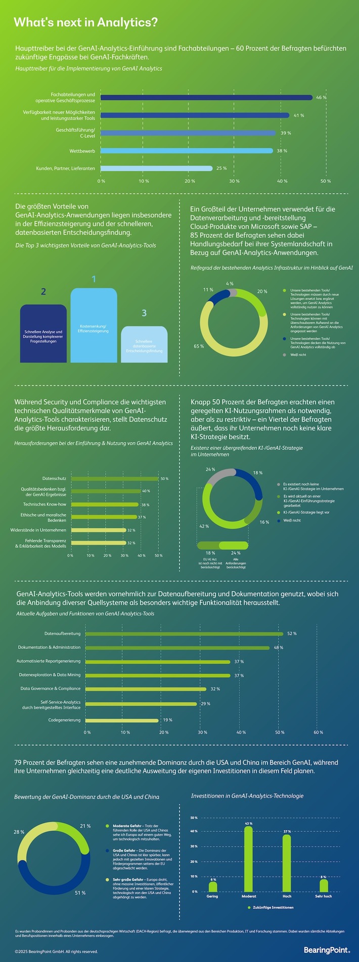 42 Prozent der Teilnehmenden einer neuen Studie der Unternehmensberatung BearingPoint verwenden oder testen bereits weitreichend GenAI im Bereich Data Analytics (GenAI Analytics) in ihren Unternehmen. GenAI Analytics bietet enormes Potenzial zur Effizienzsteigerung und Automatisierung datengetriebener Prozesse. Doch viele Unternehmen stehen bei der Umsetzung noch am Anfang – und kämpfen mit strategischen, organisatorischen und technischen Herausforderungen. 79 Prozent der Befragten fordern zudem eine stärkere gesamteuropäischen KI-Positionierung, um nicht weiter hinter den USA und China zurückzufallen.
