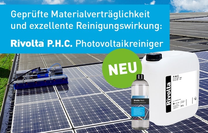 Rivolta P.H.C. bietet nun allen Firmen und Dienstleistern, welche PV-Anlagen betreiben oder reinigen, den optimalen Reiniger für eine umweltschonende und effiziente Reinigung selbst bei hartnäckigen Verschmutzungen wie Harzen, Pollen, Vogelkot, „schwarzen Pilzen“ am Modulrand oder Rückständen von Abgasen.