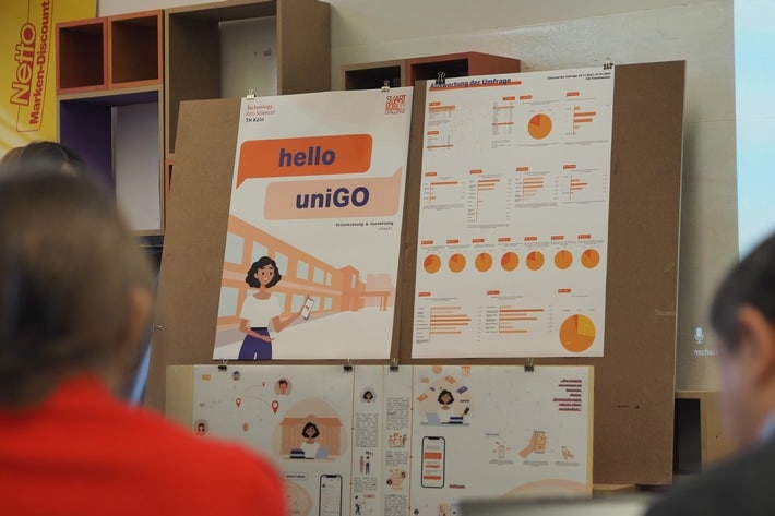 Mit ihrem stimmigen Gesamtkonzept, einem detaillierten Zeit- und Finanzplan, sowie einer sehr kreativen und professionellen Präsentation, begeisterte uniGO die Jury nachhaltig. Die Studierenden haben sich eine Lösung für das Problem der fehlenden Vernetzung und Orientierung an der TH Köln ausgedacht. Mittels der geplanten App uniGO soll der Campus von morgen innovativ, digital, personenbezogen und vor allem verständlich werden. Der Weg zur Hochschule kann dann von der Anreise bis zur Orientierung auf dem Campus bzw. in den verschiedenen Ablegern der TH nachhaltiger und effektiver gestaltet werden, individuelle Wege, wie zum Beispiel die eines Rollstuhlfahrers/-fahrerin, werden auch mittels Virtual und Augmented Reality optimiert aufgezeigt. Aber auch die Belegung und Buchung von Räumen, eine Übersicht über vorhandene Labore oder auch Angebote für Studierende sind Teil des umfassenden Angebots der App.