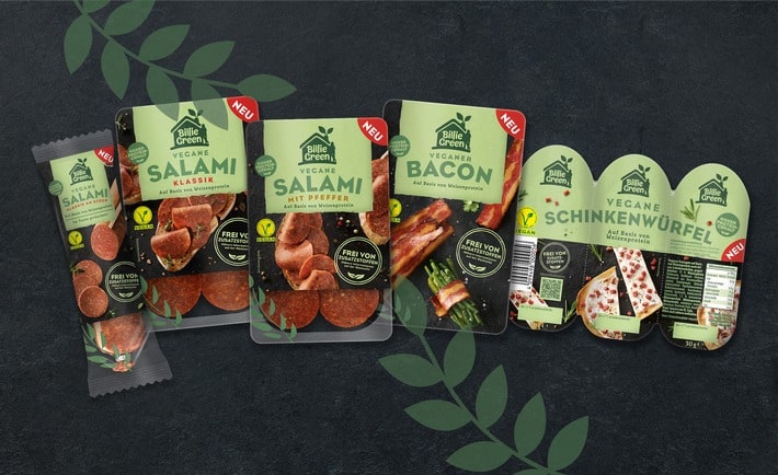 Drei vegane Salami-Variationen, vegane Schinkenwürfel und veganer Bacon: Mit insgesamt fünf Produkten auf Basis von Weizenprotein kommt die New-Food-Marke „Billie Green“ aus dem Hause InFamily Foods am 5. September in den Handel. Dank eines patentierten Herstellungsverfahrens und optimaler Produktionsbedingungen ist es dem Familienunternehmen gelungen, ein besonders authentisches Geschmackserlebnis zu kreieren und dabei als einer der ersten Hersteller in Deutschland auf den Einsatz von Zusatzstoffen für das gesamte Sortiment zu verzichten.